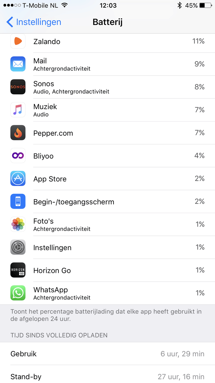 Ja inderdaad. Het percentage was nog hoger trouwens maar ik heb mijn iPhone afgelopen nacht aan laten staan (doe normaal vliegtuigmodus) om sluipverbruik te testen en dat viel gelukkig met 5% wel mee. Daarom zijn de percentages wat bijgetrokken maar gisteren had Sonos een hoger aandeel. Ik vermoed dat het komt door die nieuwe update met afspeelfuncties in het iOS bedieningspaneel. Sinds de laatste update kan je namelijk de Sonos app minimaliseren en zodoende de muziek regelen vanuit je bedieningspaneel. Hier is natuurlijk een constante verbinding met jouw Sonosapparatuur voor nodig.Geert1976 schreef op maandag 26 september 2016 @ 12:17: