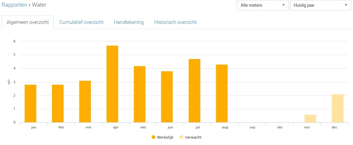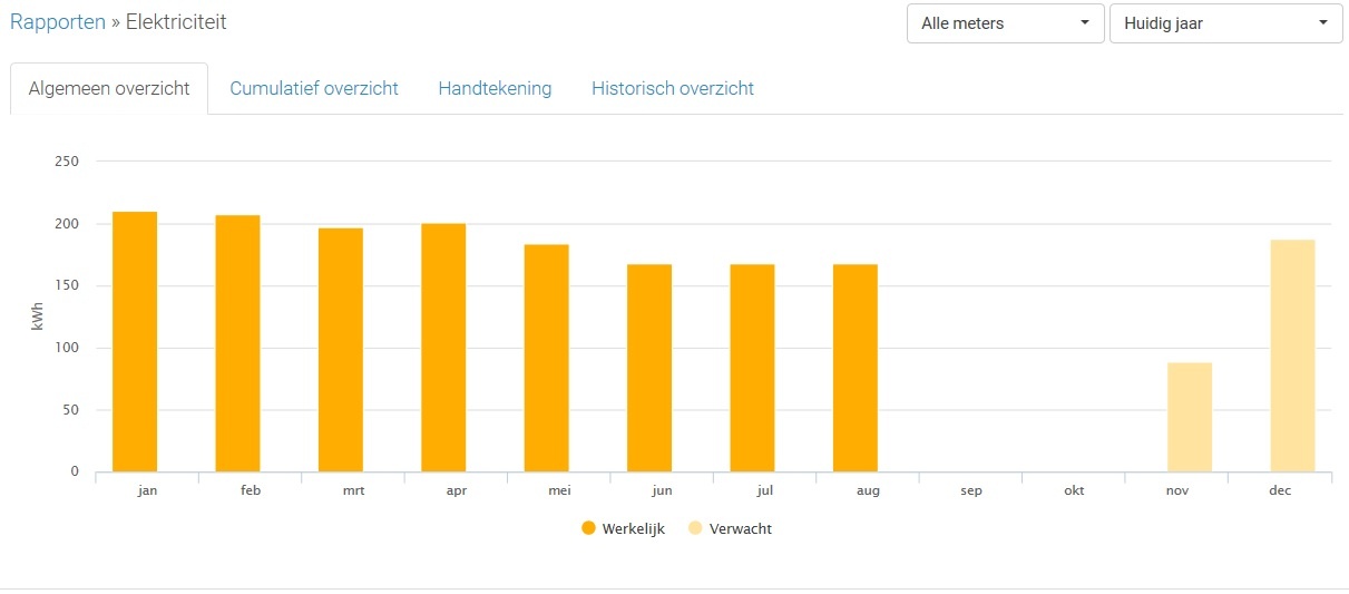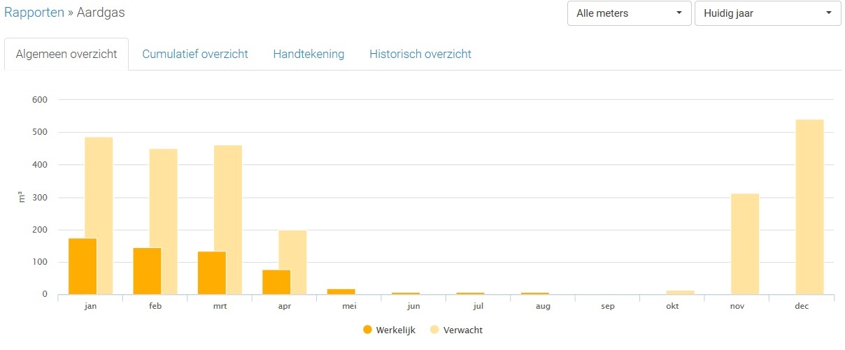 Ik hou het verbruik elke maand bij sinds ingebruikname woning in November 2015. In de grafiekjes zie je soms de 'verwachte' balken veel hoger staan, dit is omdat er nog niet voldoende meetpunten ingegeven zijn. De 'werkelijke' balken zijn correct.