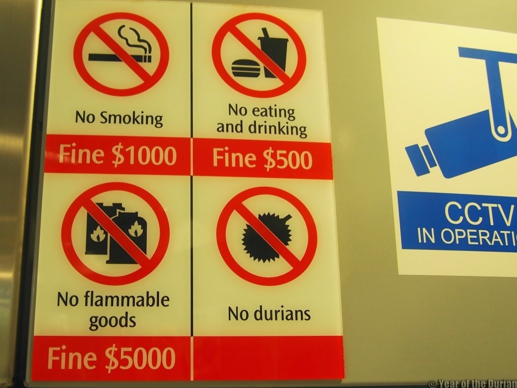 Voor zover ik weet (20 jaar geleden) was en is het nooit toegestaan geweest om Durian bij je te hebben in enig gedeelde ruimte (taxi/trein/hotelkamer/vliegtuig of wat/waar dan ook. In Signapore was er zelfs een straat voor dacht ik. Aparte zoete maar misselijkmakende geur en uiteindelijk wel ok smaak van die vrucht (smells like hell and tastes like heaven zei de gids in Maleisië - beide niet helemaal waar maar apart spul is het wel)