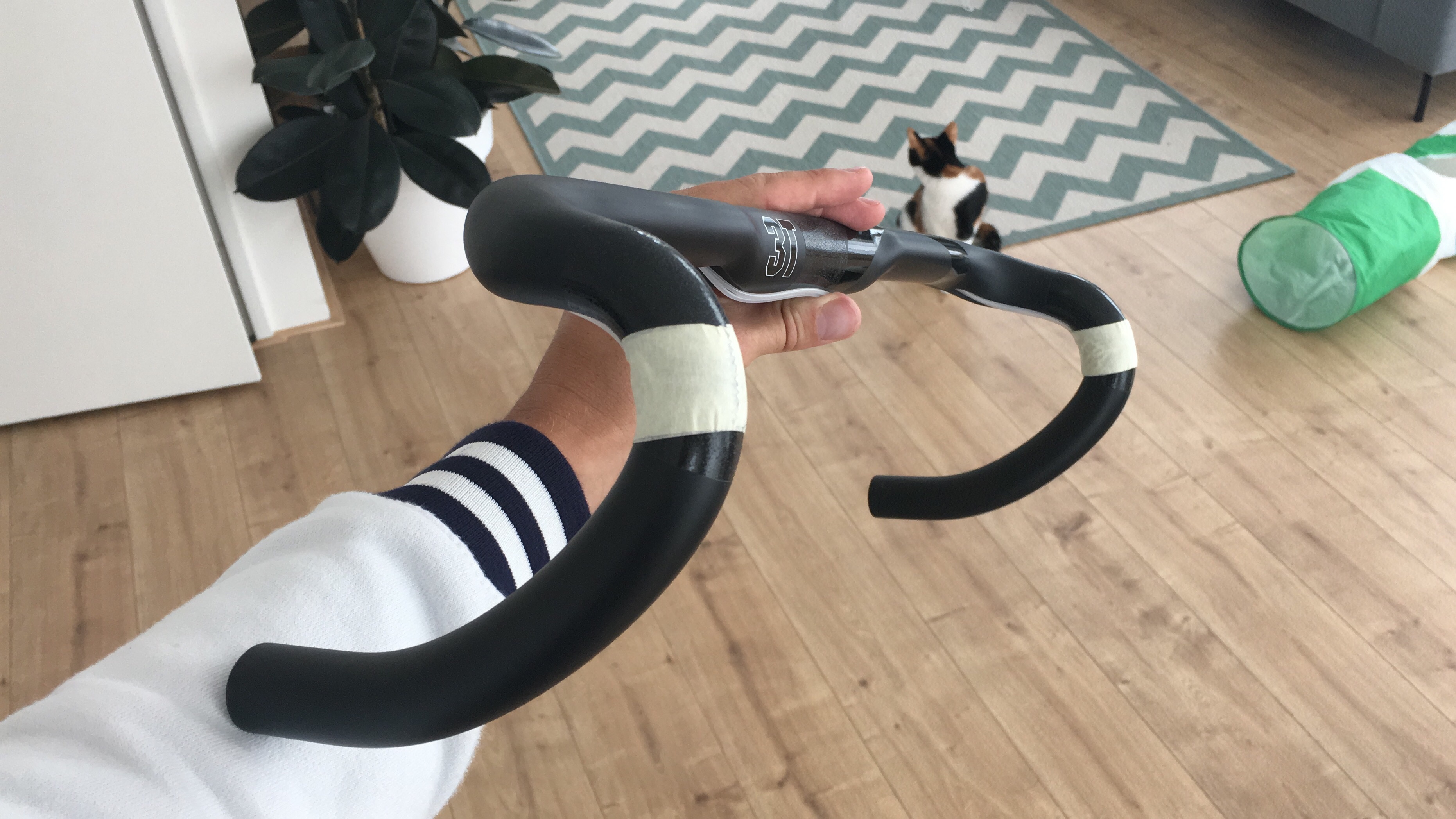 De zitpositie die ik nu heb is wel wat rechtop vanwege de hoge stack, maar qua 'strekken' vind ik dat ik een aardig goede positie heb. Stuur heeft een reach van +/- 95 mm. Stuurpen is 12 cm.