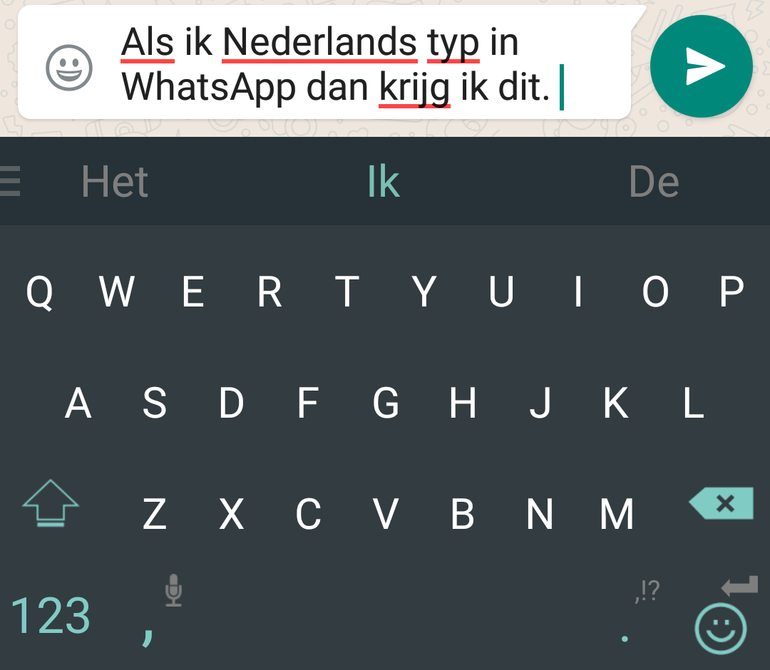 Ik heb het probleem bij WhatsApp dat bijna ieder Nederlands woord rood onderstreept wordt en dus niet herkent wordt binnen het woordenboek. Ik kan alleen niet vinden waar ik iets moet toevoegen of aanpassen om wel Nederlandse woorden er standaard in te hebben, want als ik nu perongeluk een rood onderstreept woord raak, wordt deze naar een suggestie veranderd. Iemand een idee waar ik het kan vinden? M'n oneplus 3t staat gewoon op Nederlands met Engels en Nederlands als talen in SwiftKey.