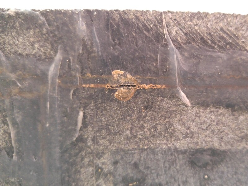Is een vierkante wasbak van natuursteen waarvan de onderkant er onderin is gelijmd en in de buurt van één van de hoeken zit nu een lek (zie de waterdruppel):
