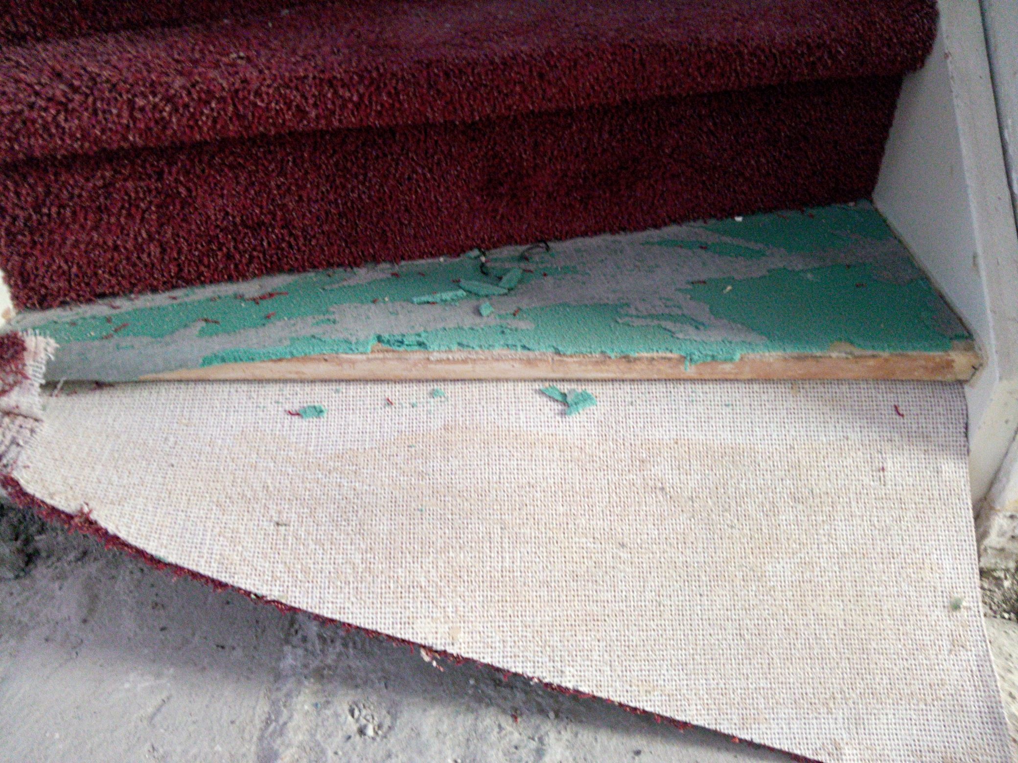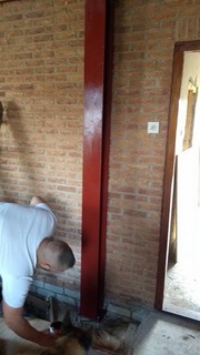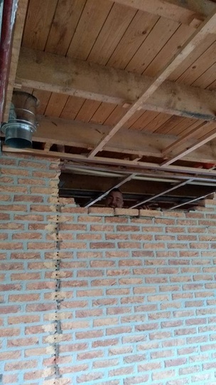 De voorzijde van het huis is namelijk gewoon een steense muur die al wat langer geleden wel geïmpregneerd is maar in het verleden hebben verschillende bewoners er wel allerlei constructies voor gezet waarschijnlijk tegen de kou/tocht. Hieronder een foto van de situatie zoals hij na het slopen van een ombouw van hardbord, het slopen van een schrootjes ombouw nog over was... de "mooie" architraven helemaal kapot gemaakt door alle ombouwen.