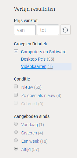 Verdere uitleg:Stel ik zoek nu op een GTX 1060 en klik op zoeken in pricewatch. Hier zou je een extra uitklapdingetje kunnen maken, waardoor je naar de categorie videokaarten gaat. Hier zou je dan gebruik kunnen maken van de volle filterfunctionaliteit van tweakers.net. Vele andere sites gebruiken dit ook, bijvoorbeeld marktplaats. Zie hier een voorbeeld van marktplaats. Ik heb hier gezocht op GTX 1060, kan dan klikken op videokaarten en krijg vervolgens toegang tot alle filters.