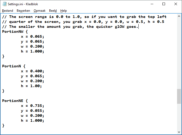 amBX control software : glOW 0.16 met scherm kwadrant indeling in onderstaande afbeelding, en een screensampling tijd van 80ms.
