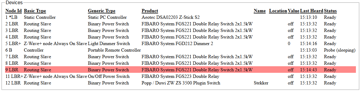 In onderstaande tabel betreft het node 9 welke zijn status niet update naar de controller toe als de wandschakelaar wordt gebruikt. Deze node heeft via zowel node 5 als node 3 een route naar de controller (1).