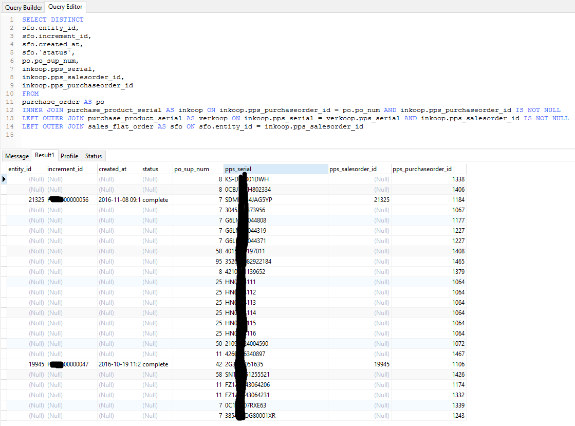 In totaal bevindt zich de data in 4 tabellen namelijk: sales_flat_order, purchase_product_serial, purchase_order en purchase_supplier