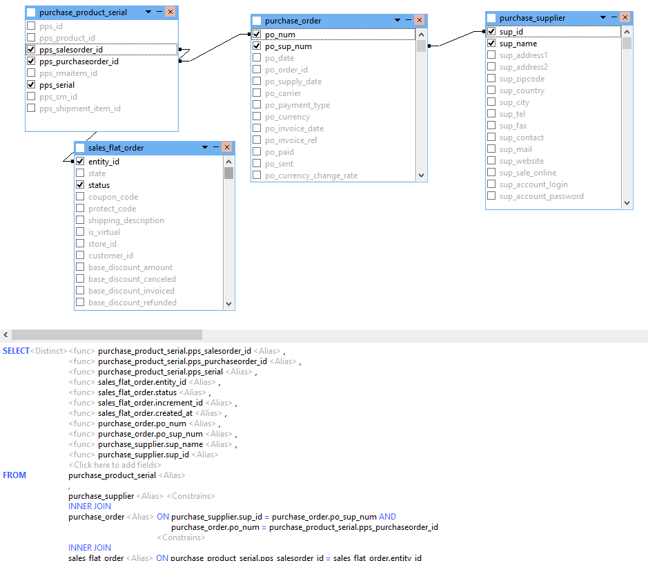 Op zich de data ophalen is geen probleem echter is bij de tabel purchase_product_serial een probleem dat het serienummer op 2 regels staat, namelijk voor de inkoop order en voor de verkoop order.