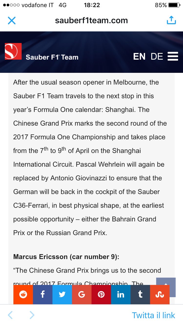 Dat Wehrlein niet fit is om te rijden lijkt mij niet het probleem van Sauber? Lullig dat Mercedes er bakken geld voor neergooit, maar dan had Wehrlein maar moeten zorgen dat hij er stond en fit was.Martinspire schreef op maandag 3 april 2017 @ 21:02: