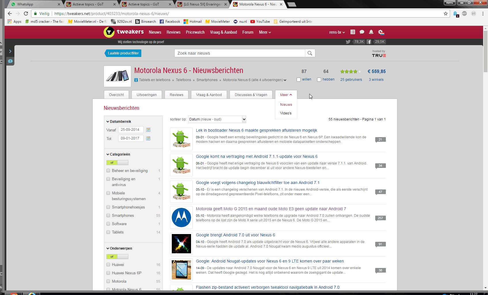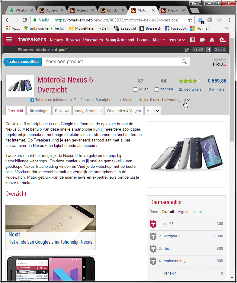 Als er in de Pricewatch gekeken wordt naar een product, bijvoorbeeld: product: Motorola Nexus 6. Zijn daar allemaal tabs te vinden voor: