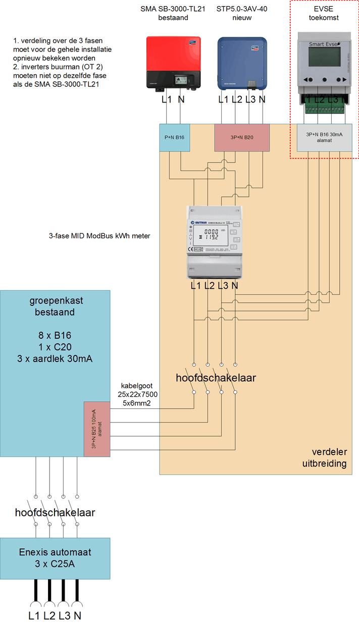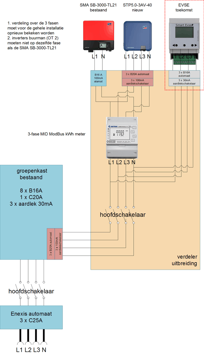 Maar toch alleen maar omdat je beide omvormers op 1 kabel wilt zetten?? Bij aparte kabels naar de hoofdgroepenkast kun je het toch met B16 automaten af?Zoals eerder aangegeven moet ik 1 van de fases op 20A afzekeren