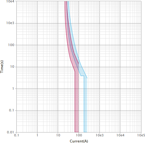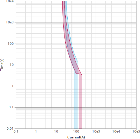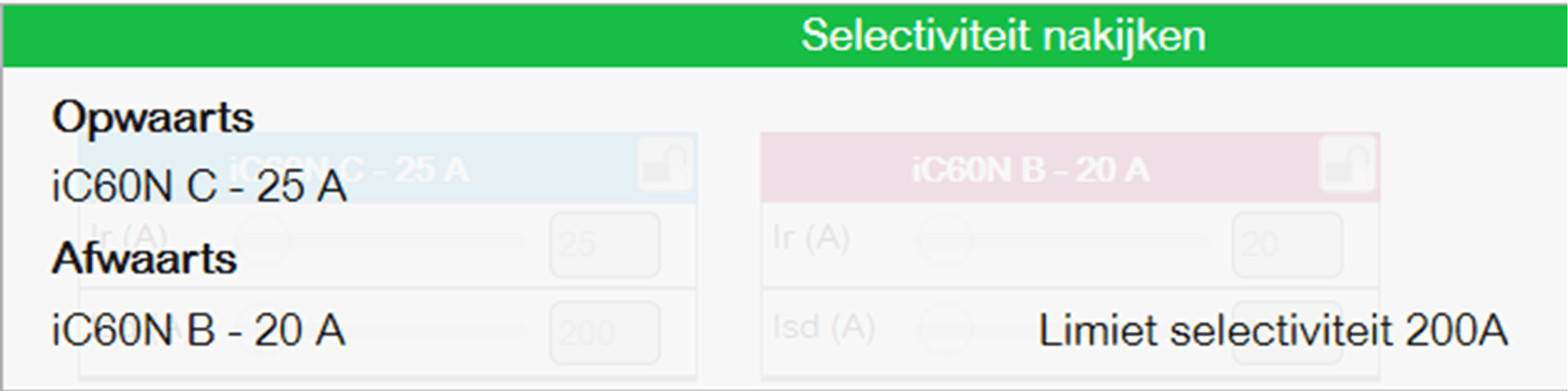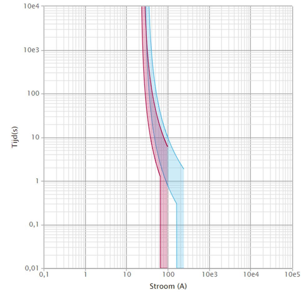 Rood is de achterliggende C20 automaat, die in het magnetische gebied dus later reageert dan de blauwe B25 voorbeveiliging, dus hoe dit tot 100A selectief moet zijn?