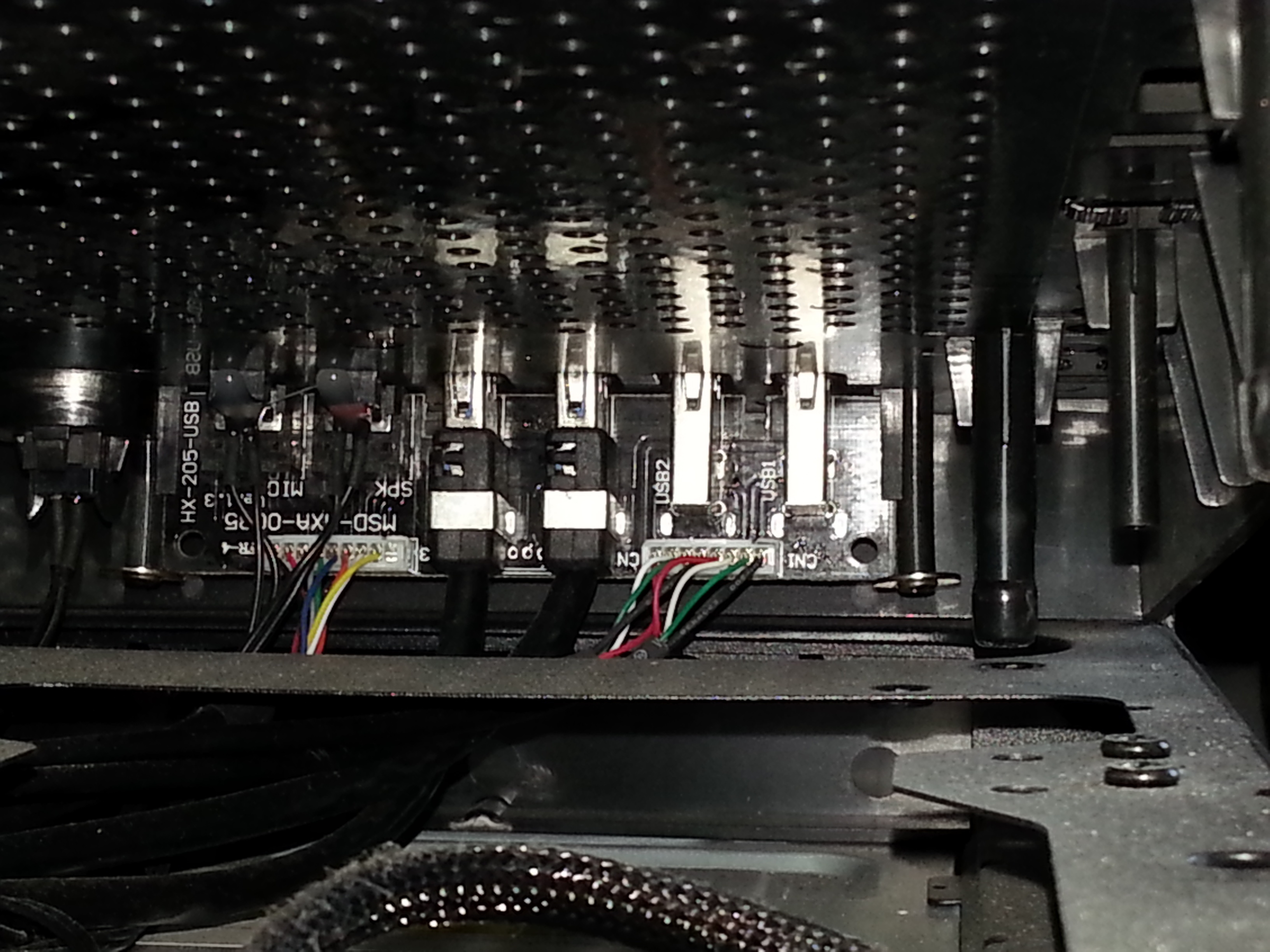 USB 3.0 werkt prima, USB 2.0 werkt niet. Als ik van binnen de aansluitingen bekijk mis ik volgens mij kabeltjes van de USB 2.0 aansluiting naar het moederbord, zie foto: