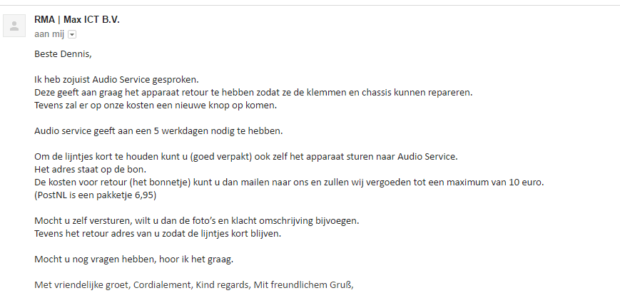 Ongeacht het verdere verloop, zou ik vandaag nog een ingebrekestelling opstellen en in ieder geval alvast per e-mail doen toekomen, waarin je een finale datum noemt waarin het probleem definitief opgelost moet zijn. Zeg, 2 weken nadat ze het ontvangen hebben. Reageren ze op die mail, dan is dat sowieso een ontvangstbevestiging en hoef je ook niet meer aangetekend aan de gang