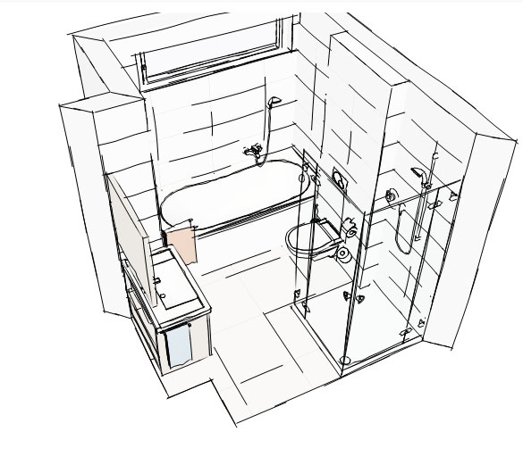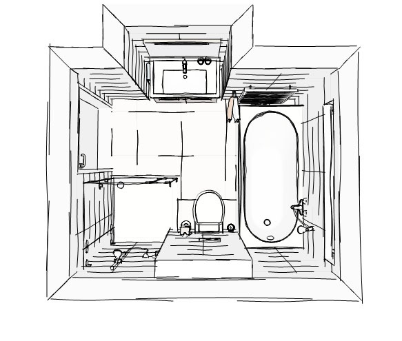 Bij ons bestaat de nieuwbouwbadkamer (2×3,5m) uit de volgende onderdelen: