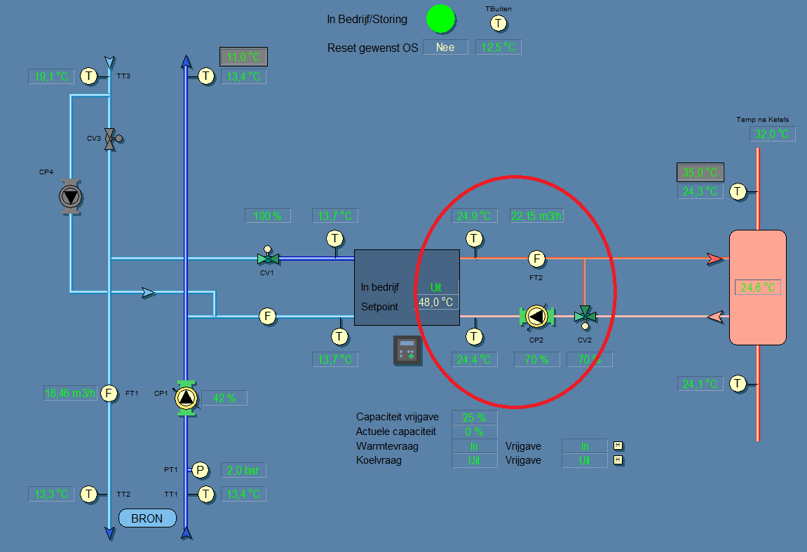 Uit de warmtewisselaar komt dan zeg maar 50°C wat dan gemixed wordt met de retour uit de radiatoren (16°C) wat bij gelijke flow van beide paden in 33°C retour naar CV geeft. Dit gaat dan gelijk weer als aanvoer naar de radiatoren en WPB (op gegeven moment kan het zijn dat de CV brander ook aan gaat).