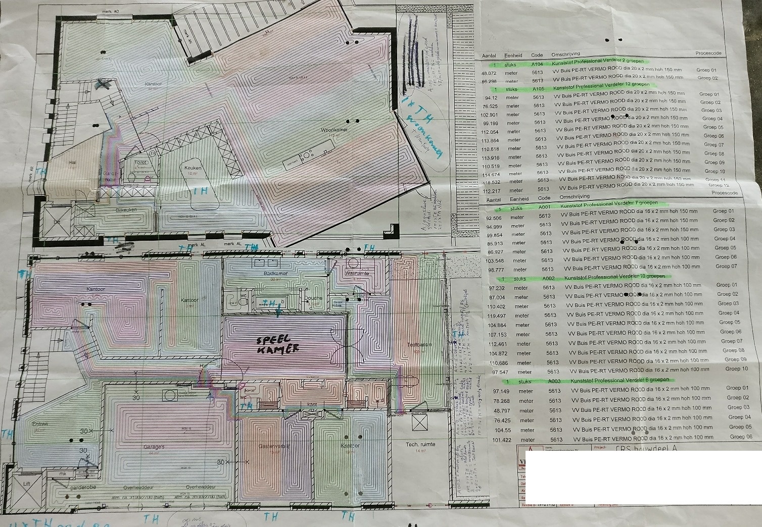 Want 6,4m2 met DN16 of DN20 spiraal heeft veel leidingweerstand en mag je blij zijn als je 15-20ltr/min haalt (~5kW met dT=4), met 6x kortere spiraal heb je al 12kPa drukverval.