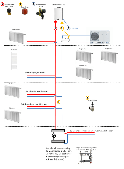 Onderstaand de setup, nu met een open verdeler toegevoegd in de retourleiding.