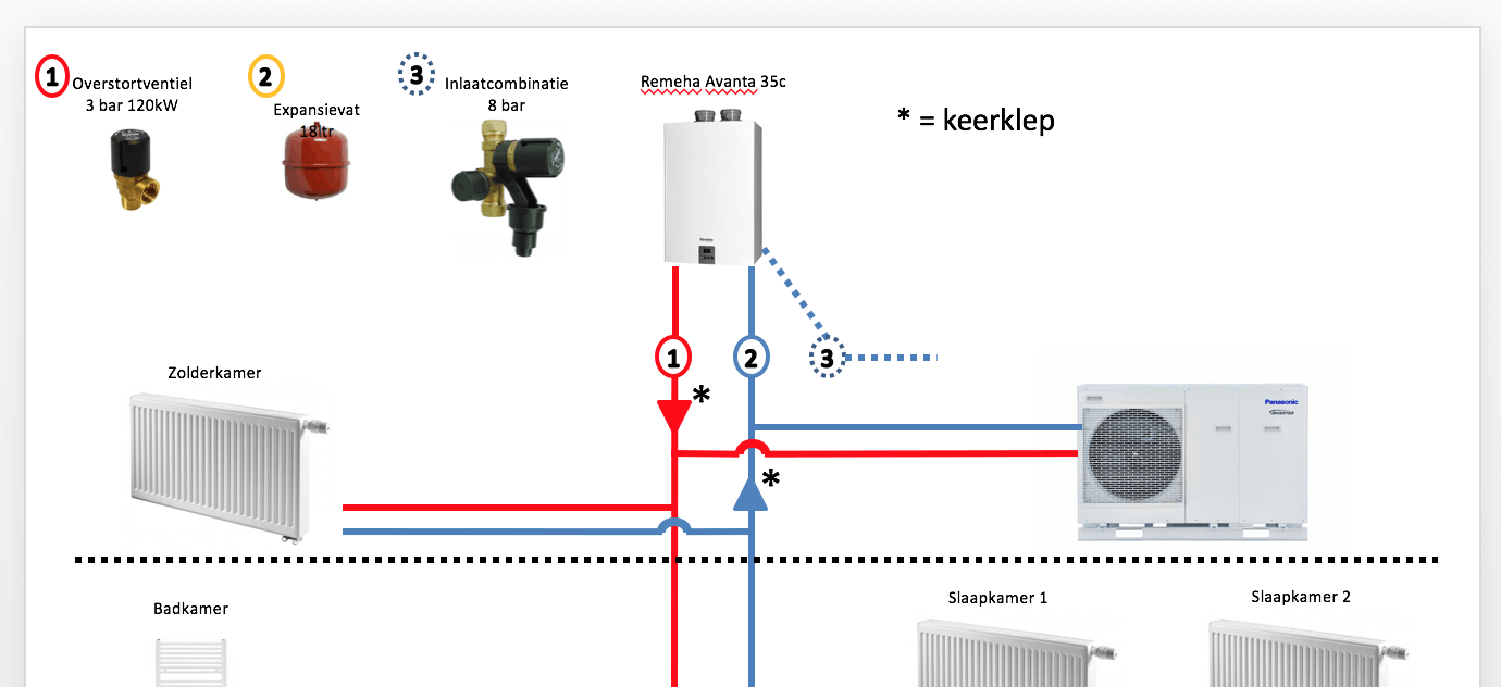 Eventueel met een keerklep op VV-verdeler om warme aanvoer van gas-CV buiten te houden, zodat VV alleen door WP verwarmt wordt en gas-Cv indien er meer warmte nodig is de radiatoren