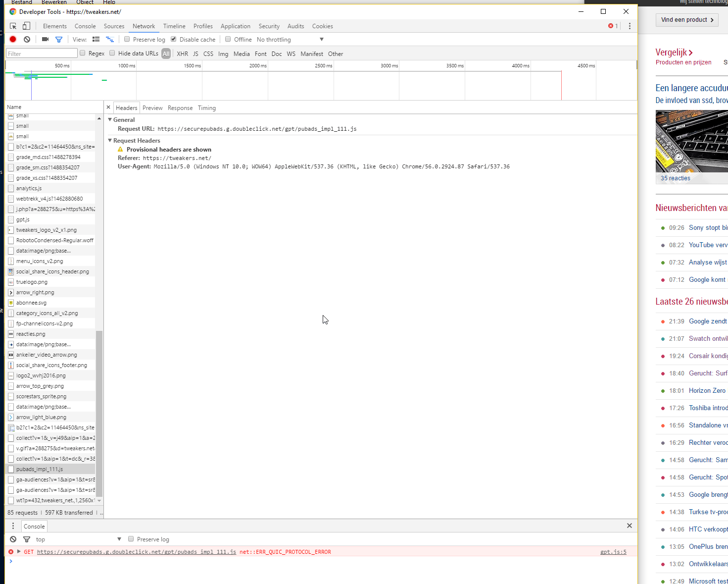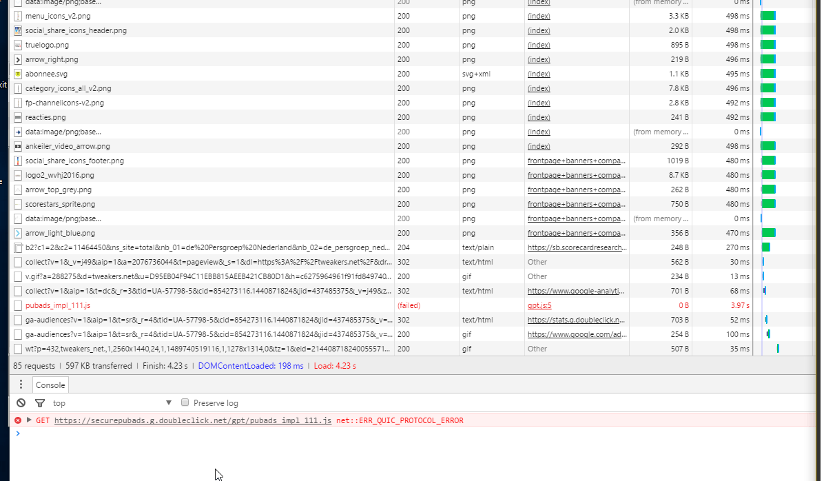 Ik krijg de melding niet altijd en ads lijken het inderdaad ook niet te doen. Ik krijg een Quic protocol error in Developer Tools op een script van de advertentieboer. Zie screenshots: