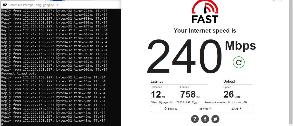 Op fast.com een loaded latency van: 636 ms, unloaded: 12ms