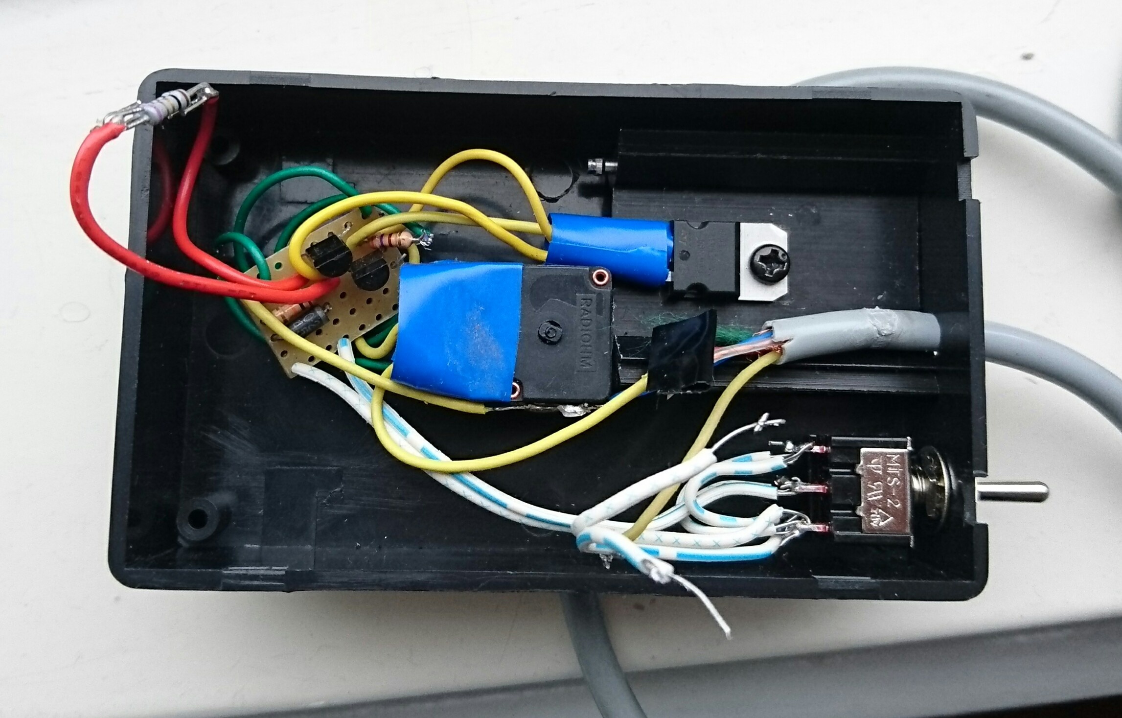 Van de benodigde onderdelen hadden ze bij de legerdump de BD375 niet, maar wel een BD911 voor de T2. De BD911 kan 100V 12A aan en nam aan dat de BD911 een 'sterker' broertje is van de BD375 is en heb de 911 daarom gebruikt, de rijgegelaar gesoldeerd en na het solderen en in een handzaam behuizinkje gestopt.
