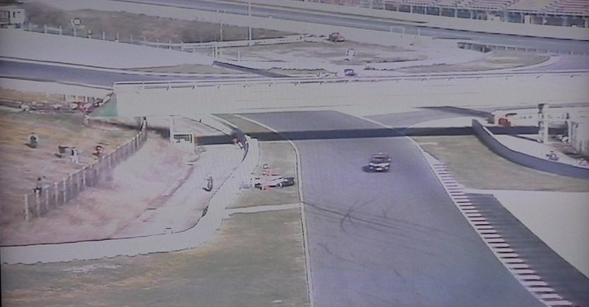 Foto is wat onduidelijk, maar de strepen op het wegdek zeggen wel genoeg. Gokje? Kerbs, koude banden en te vroeg op het gas.