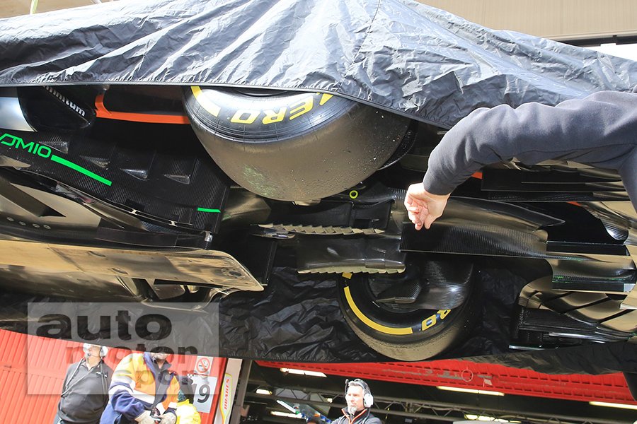 Mercedes oddly shaped rear crash structure & Force India underbody.