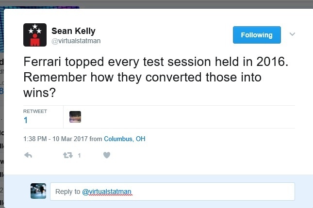 Het lijkt er eerder op dat Ferrari er telkens voor kiest om redelijk positief voor de dag te komen tijdens het testen, waarschijnlijk om de Italiaanse pers rustig te houden.Icephase schreef op vrijdag 10 maart 2017 @ 13:24: