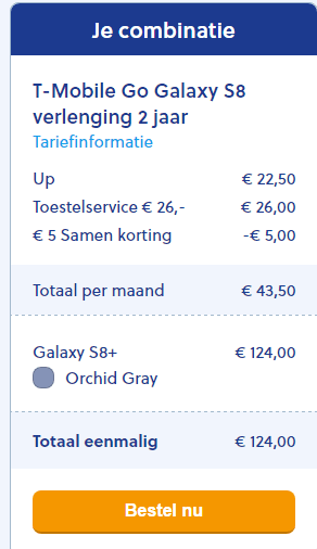 Ik betaal nu voor de S8 netto € 40,50 per maand, incl. € 5,- samen korting bij T-mobile met 5Gb en de rest onbeperkt. Totaal € 972,- over 24 maanden.