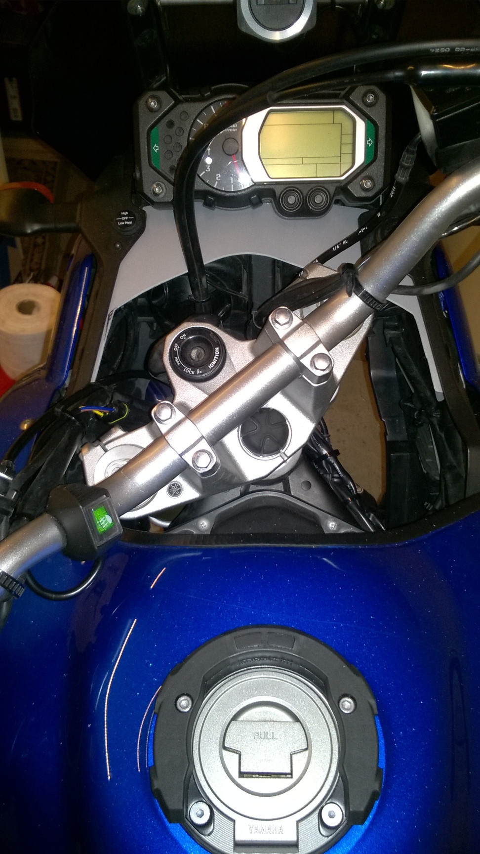 Zou ik later nog wat accessoires er bij weten te verzinnen (na de mistlampen, tomtom, en handvatverwarming, ABS schakelaar), heb ik nu ook weer plek om een schakelaartje te monteren.
