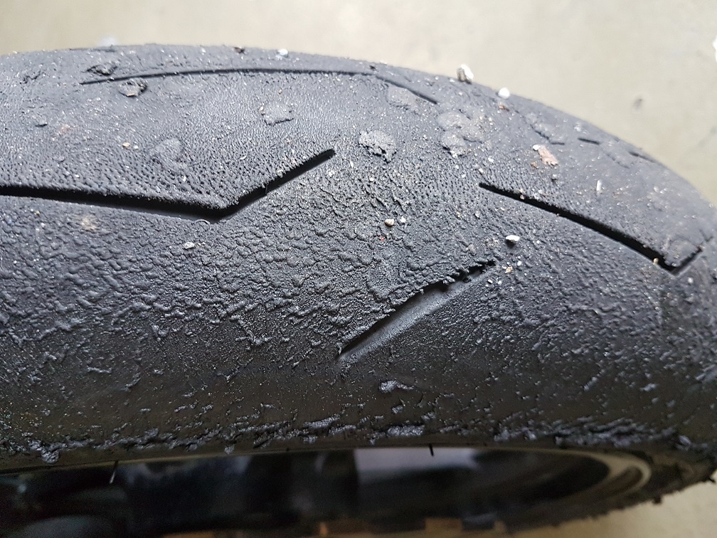 Een motorlaars maakt de weg te slijten oppervlakte fors groter en dus is er meer energie nodig om het materiaal zover weg te slijten dat je enkel het haasje is.