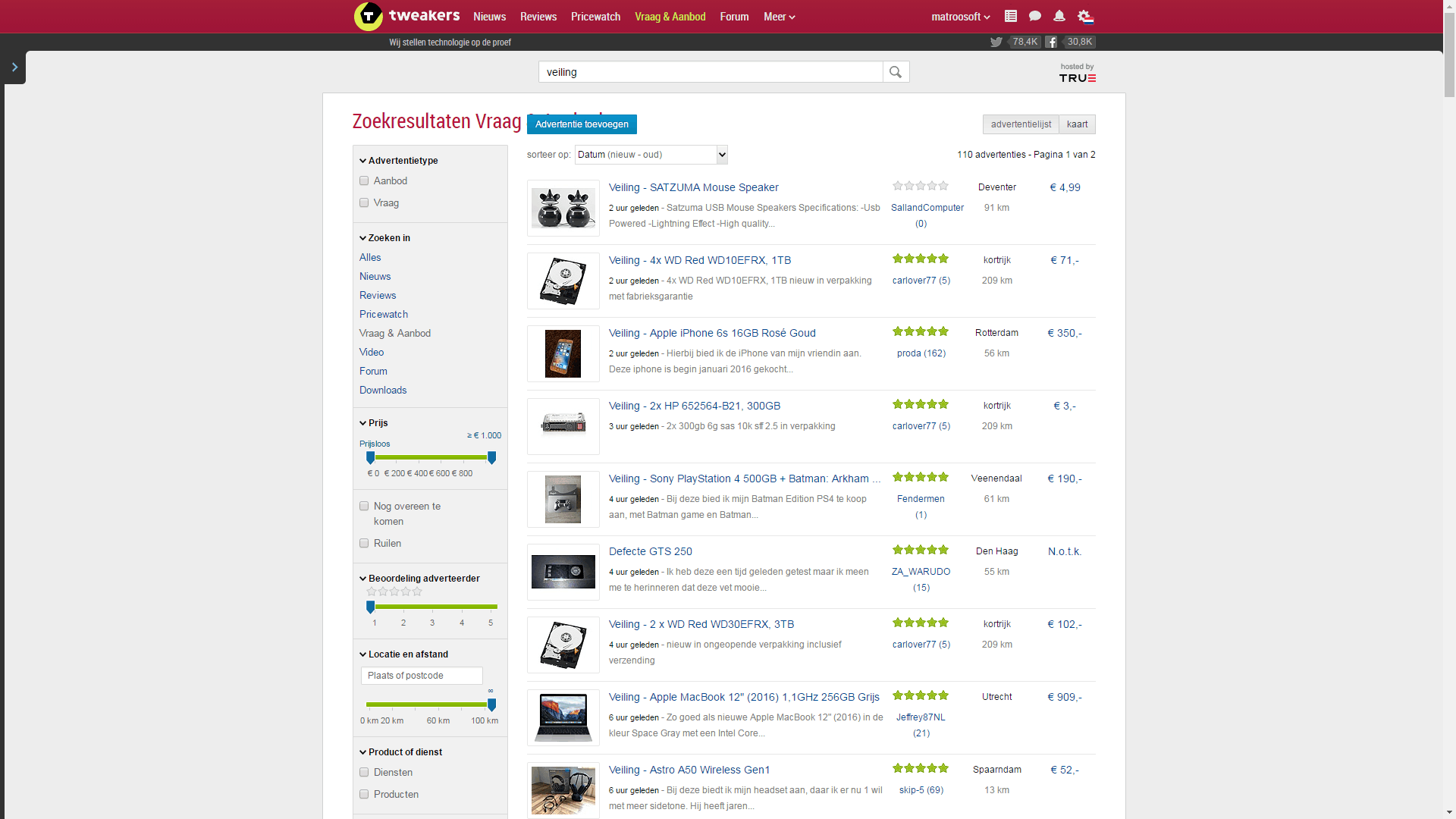 Als ik zoek op 'veiling' in de V&A, staat de button voor het plaatsen van een advertentie op de verkeerde plek. Lijkt zich alleen voor te doen bij zoekacties die niet gekoppeld zijn aan productcategoriën, want als je daarop zoekt staat de button wel op de juiste plaats. Heb custom CSS uitgezet dus dat kan het niet zijn.