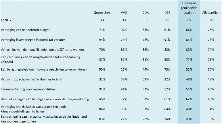 Als je de tegenstelling GroenLinks-VVD/CDA qua achterban echt duidelijk wilt zien dan moet je kijken naar de onderzoeken van Maurice de Hond: daar staan stellingen uitgesplitst naar partij en daar zijn deze groepen meestal precies tegenovergesteld qua mening.