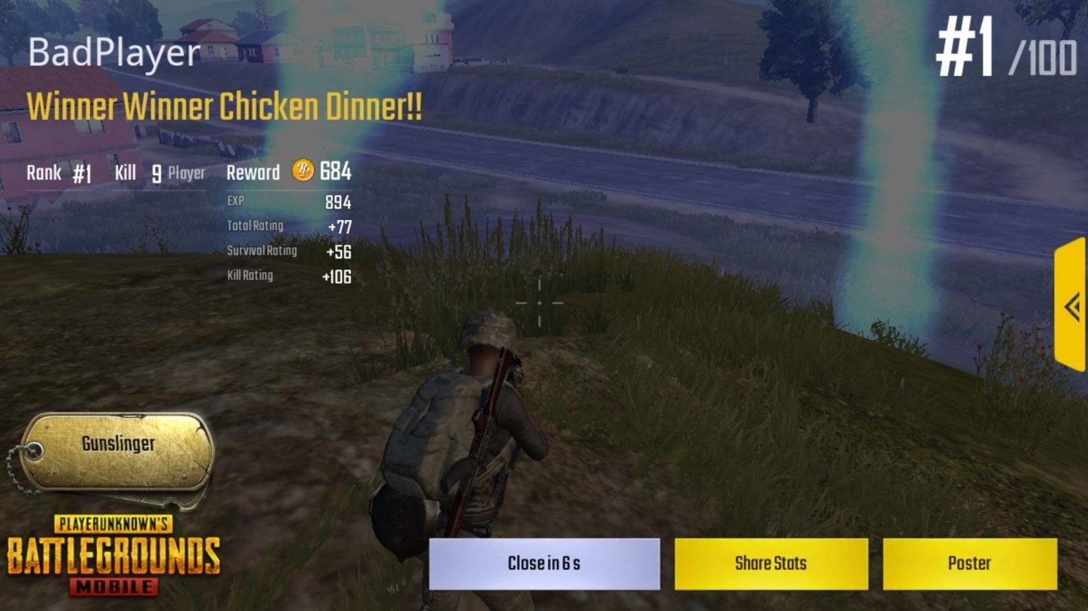 Ik rij nog even door en ren een huis in midden in de cirkel. Ik steel nog twee long-range kills met de mini en verstop me vervolgens in een badkamer achter het douchegordijn. Er komt nog een squad in mijn huis maar die vinden mij niet en lopen uiteindelijk door naar de cirkel. Ik sluip er achteraan rond een heuveltje om de laatste twee van dat squad neer te halen met de Vector. Vervolgens is het 1v2 en ik maak ze beiden af weer met de Vector. Zelf ook een paar keer flink damage gepakt maar alhoewel andere wapens in de buurt komen van de TTK van een Vector* is er geen enkel wapen dat daadwerkelijk een lagere TTK heeft. Daardoor weet ik telkens net te winnen.