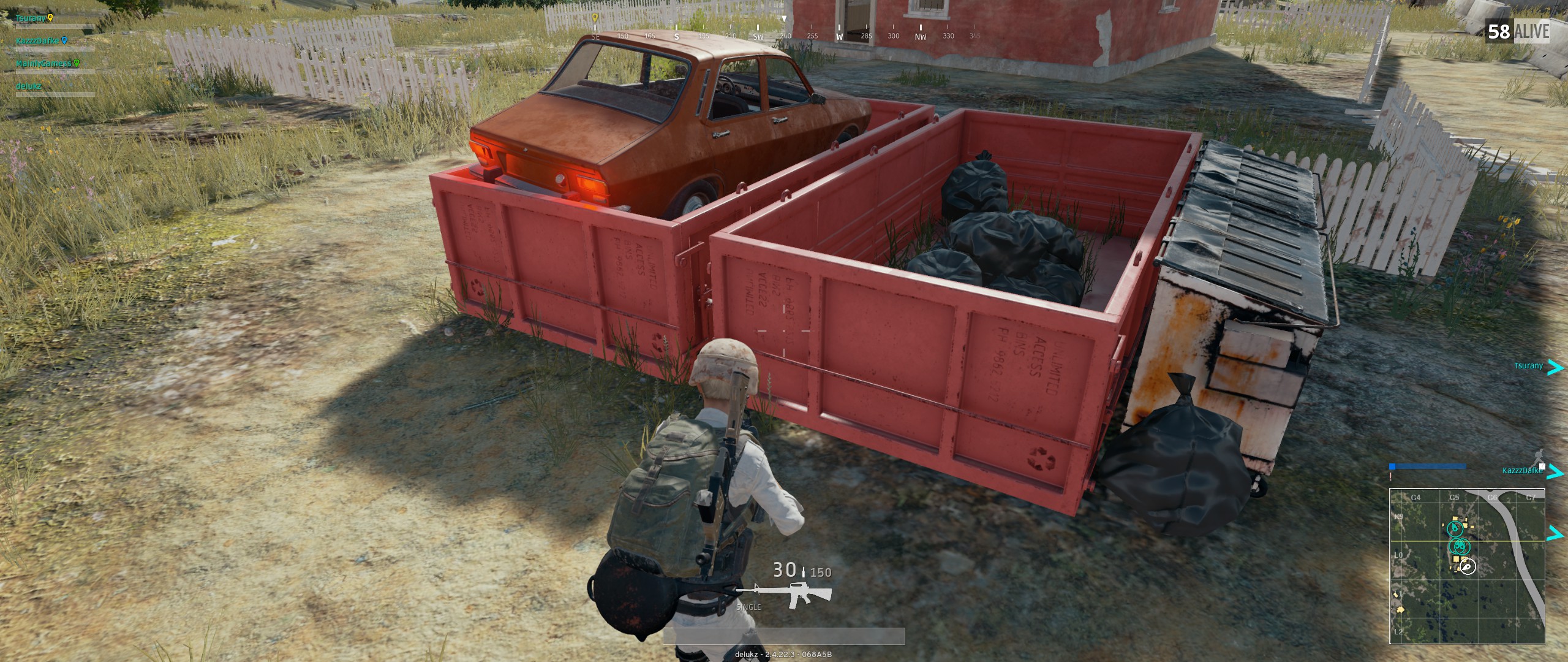 Uiteindelijk waren er nog 3 man over waarvan ik wist dat er 1 onder me bij het strand zat omdat die gast continue aan het schieten was, ik lag bovenop tussen een steen en gras in en was niet te zien. Stonden nog een paar containers die net in play waren waardoor de kans groot was dat die gast daar zat.
