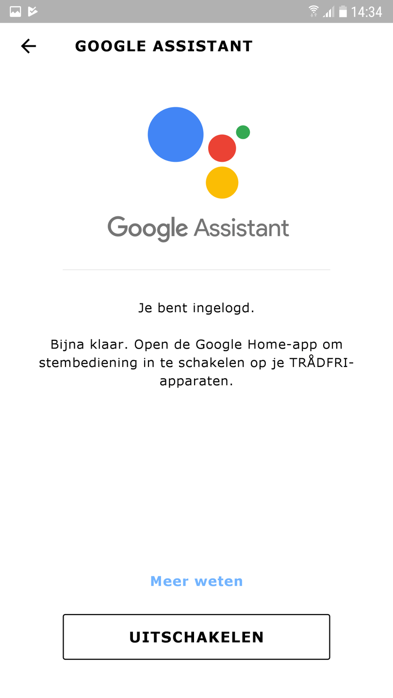 Wel zie ik in m'n google account settings dat Tradfri gekoppeld is, dus blijkbaar is er wel iets gebeurd bij het enablen vanuit de Tradfri app, maar kan het proces niet volledig afgemaakt worden.