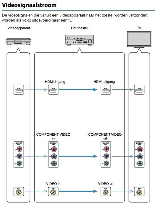 Ik wil mijn SNES gebruiken op mijn TV. Mijn TV is verbonden aan een Yamaha RX-V475 via een HDMI kabel. Mijn SNES heeft een kabel met een composite uitgang dus rood, wit (geluid) en geel (video). Ik heb het als volgt aangesloten: