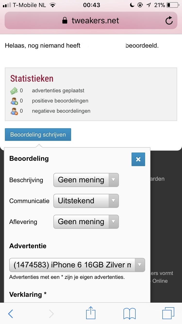 Als je een beoordeling V&A wilt achterlaten op iemands profiel, dan kan dat niet als die Tweaker nog geen enkele beoordeling heeft.