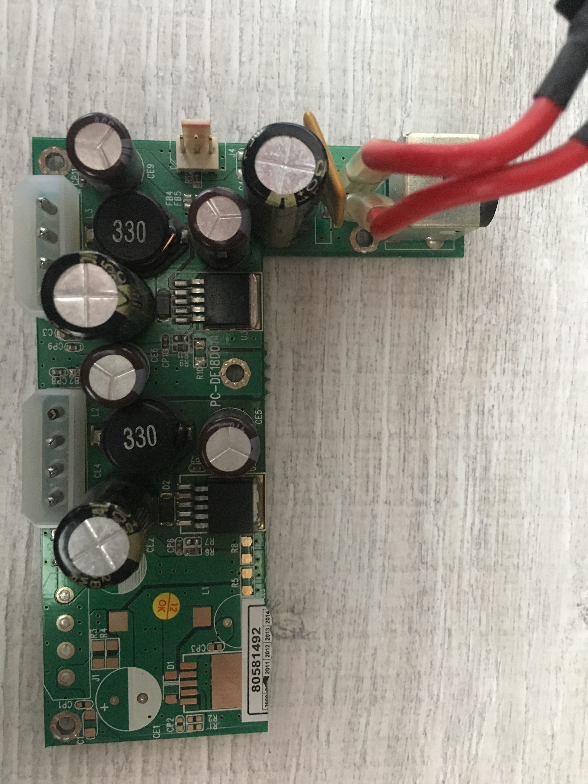 Voor een CCTV-systeem wordt gebruik gemaakt van een HDD-recorder. Deze heeft het onlangs begeven. Ik heb de recorder opengeschroeft, en kwam erachter dat het voedingsprintje lijkt te zijn doorgefikt. En inderdaad, zonder harde schijf start de recorder goed op, maar zodra het printje meer vermogen moet leveren (lees: harde schijf), dan start de recorder niet op (en ik meet ook geen spanning meer).