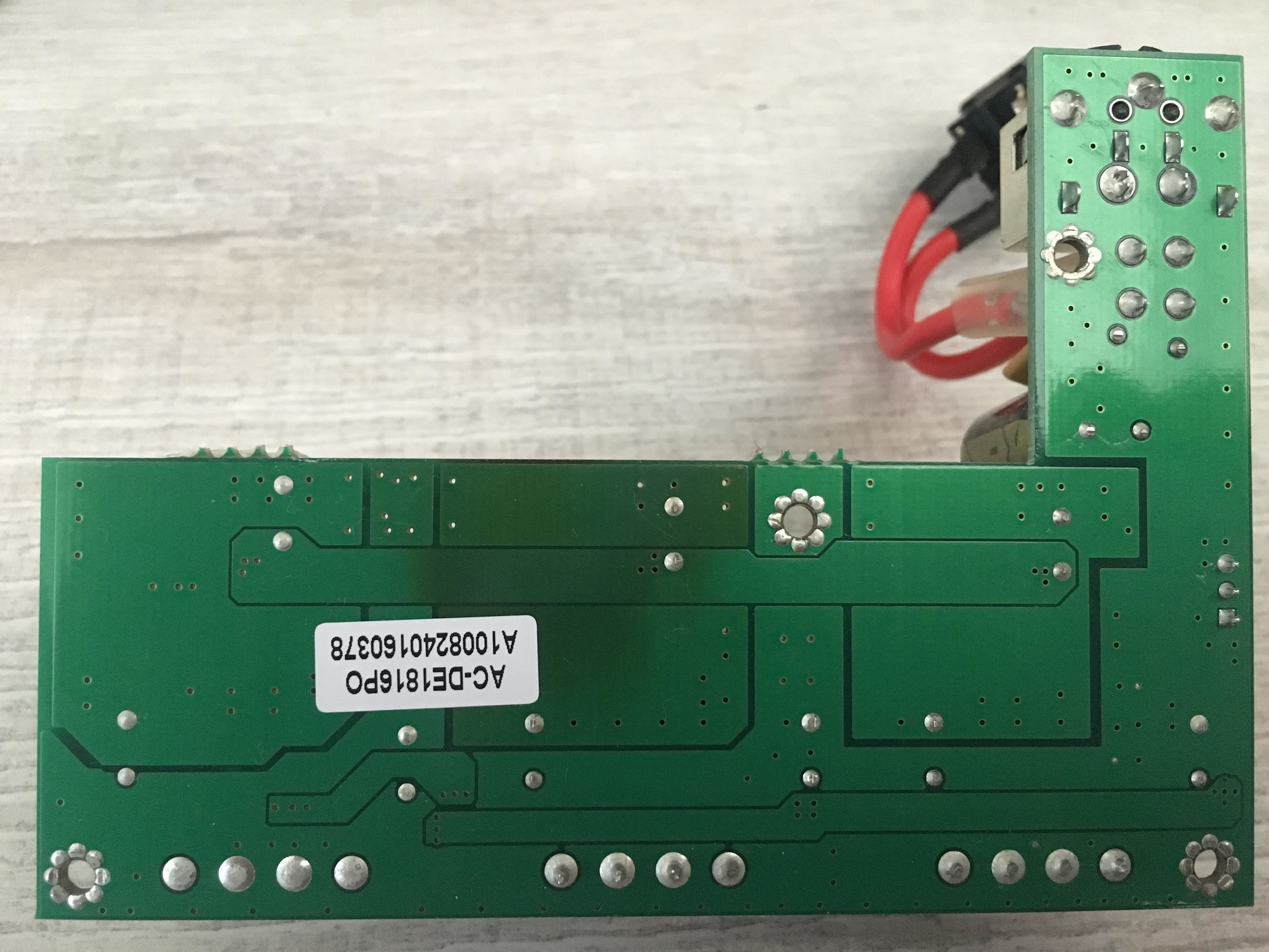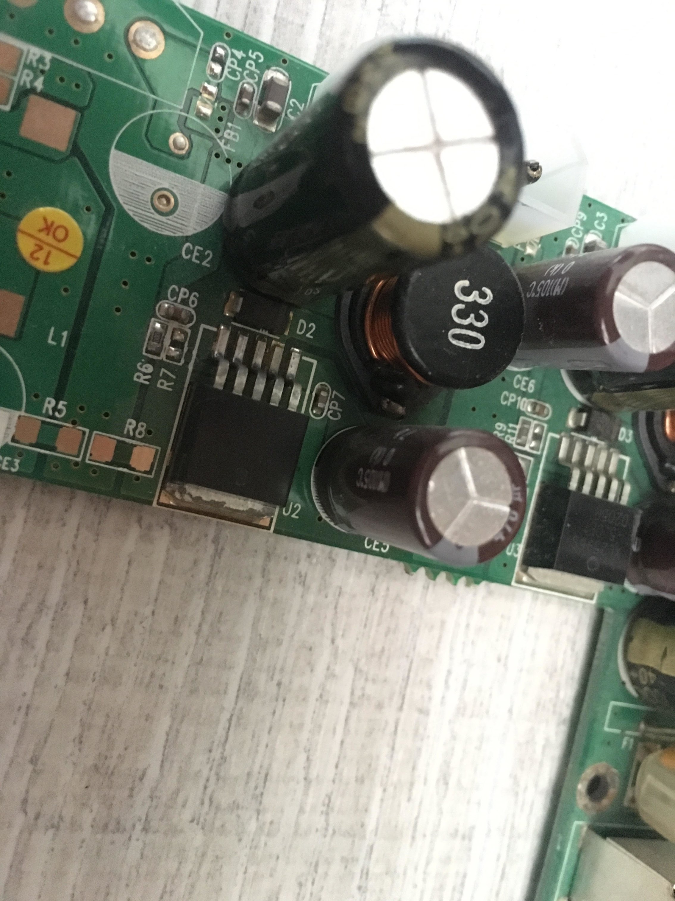 Op het printje is een donkerbruine plek te zien, vermoedelijk door oververhitting van de spanningsregelaar (als ik het zo zie).
