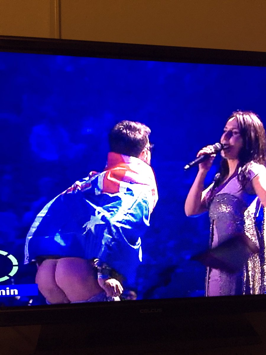ja dat mag niet op de UK tv! hij kreeg wel ruim de tijd om nog 'ns een rondje om Jamala heen te draaien voor ie met een tackle van het podium werd gewerkt!
