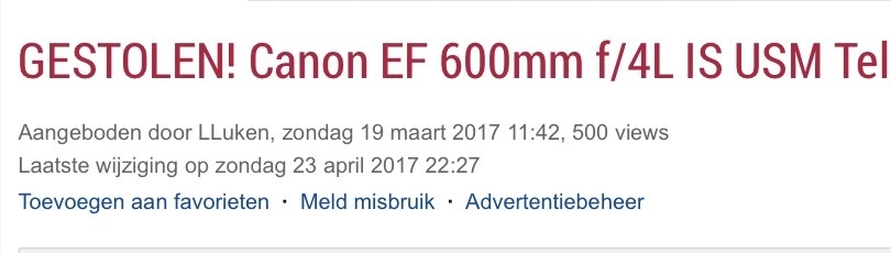 Ryan1981 schreef op donderdag 11 mei 2017 @ 15:23: Ik wist niet zeker waar ik mijn opmerkelijke vonst kwijt moet dus probeer ik het hier eerst maar: V&A aangeboden: GESTOLEN! Canon EF 600mm f/4L IS USM Telelens