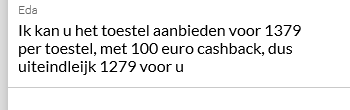 Gisteren zelf weer ervaren bij Plattetv.nl, eerste waar de verkoopster mee schermde toen ik om een "tweakers prijs" vroeg voor een 65OLED854. Wilde een magere inruil voor mijn huidige oled prijs bieden op hun adviesprijs, maar uitgaande van de Philips advies prijs, voor mij dus een Nogo.[b]Powder Toastman in "[LG OLED] Ervaringen & Discussie"Powder Toastman schreef op dinsdag 8 oktober 2019 @i.Stijn