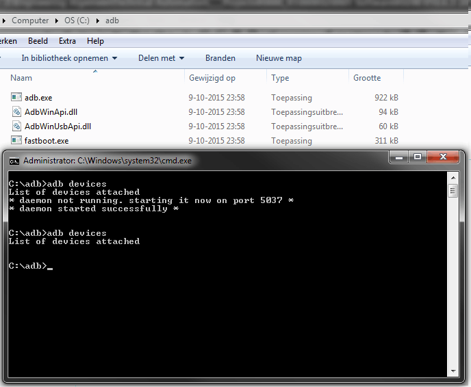 Ga ik echter naar C:\adb en ik doe daar hetzelfde dan werkt het wel: