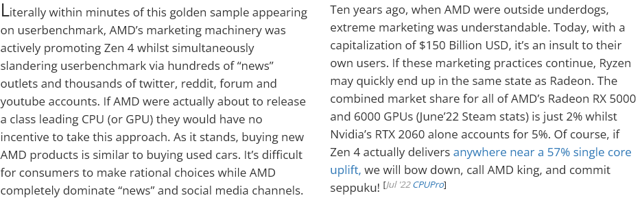 Ik denk dat ik Userbenchmark al snap. Die kleuters zijn natuurlijk AVX-512 enorm gaan pushen omdat Zen 3 het niet heeft. Zen 4 ondersteund blijkbaar AVX-512 wel en vermoedelijk dus veel beter dan Intel doet met Alder Lake.