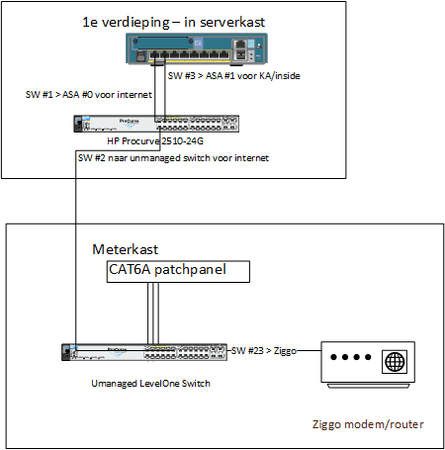 Patch 5 heb ik in de ruimte aangesloten op een managed HP switch poort 2, en poort 1 van die switch zit op de 'internet' poort van de firewall. Poort 3 van de switch is aangesloten op poort 1 van de firewall (de 'interne / ka' poort). Op deze manier heeft mijn server, vm's etc internet.