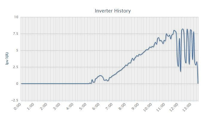 Als de spanning daalt als de stroom dipt, is er gewoon niet meer vermogen beschikbaar -> bewolking of paneelprobleem.