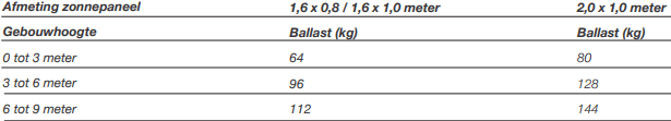 Valk solar systems schrijft voor valkbox 3. 8 -9 tegels (afh hoogte) voor windgebied 1, windgebied 2 10-11 en windgebied 3 12-14 tegels. Zij gaan uit van 1 tegel is 9 kilo dus 72-81 kilo, 90-99 kilo of 108-126 kilo afh van het gebied in NL.