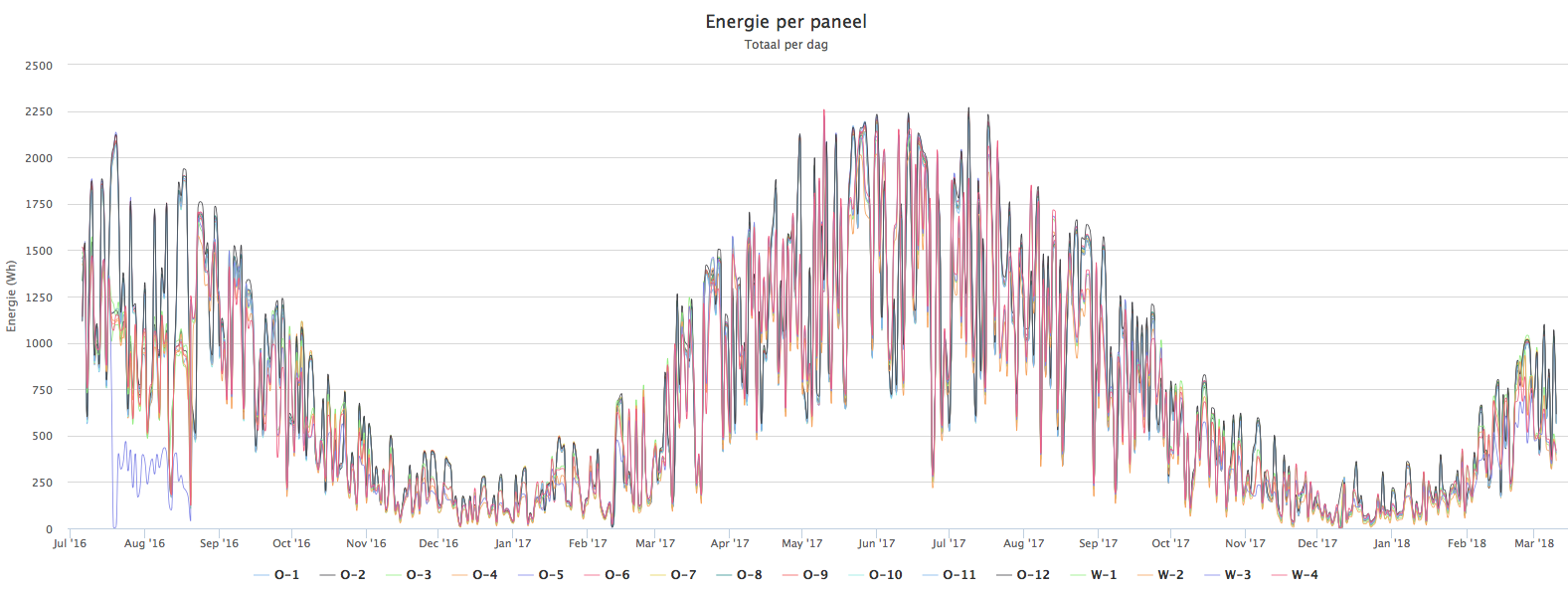Mijn 335Wp-panelen op Oost/West 40graden pieken over de 400Watt en leveren per paneel max 2,2kWh per dag op:PS hoeveel Watt produceerd een 300 W paneel max in Oost of West opstelling op een zonnige dag?